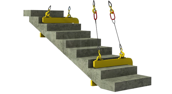 Такое приспособление как захват для монтажа лестничных маршей рекомендуем выбирать, ориентируясь на длину несущего элемента, и чтобы она точно подходила к ширине пролета, что в конечном результате позволит определить его очень близко к стене. При этом два захвата можно соединить с помощью специальных стропов.